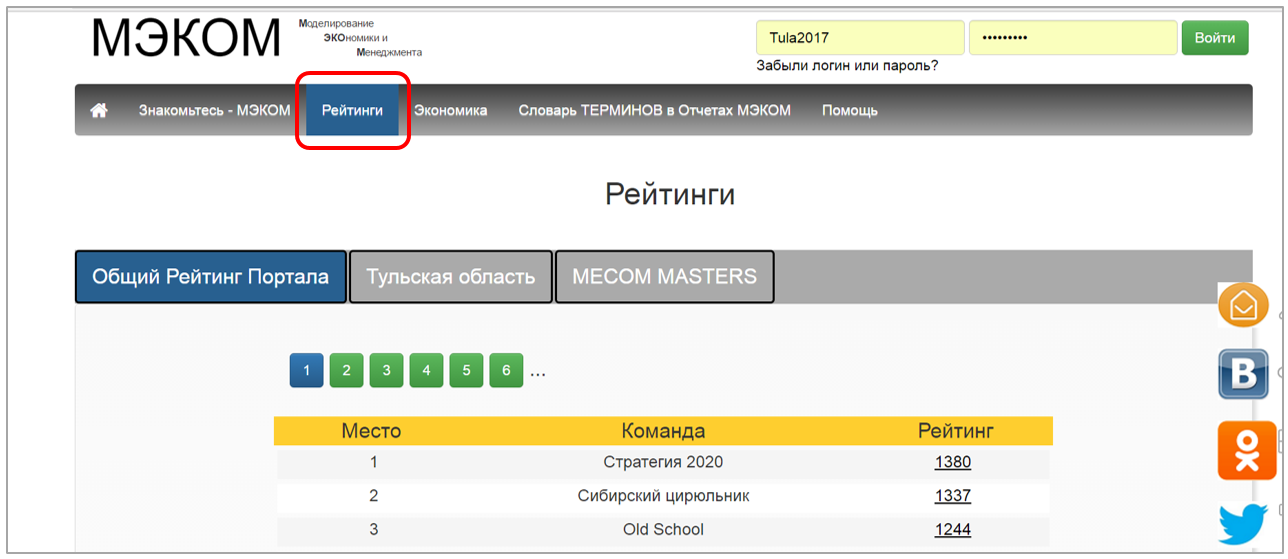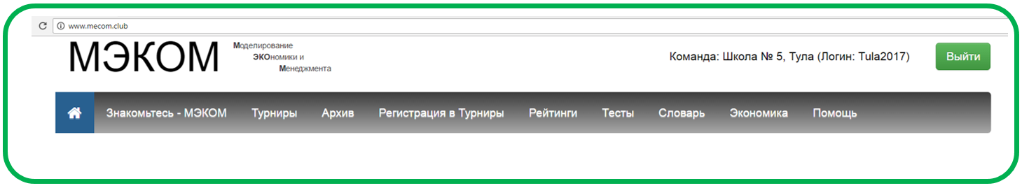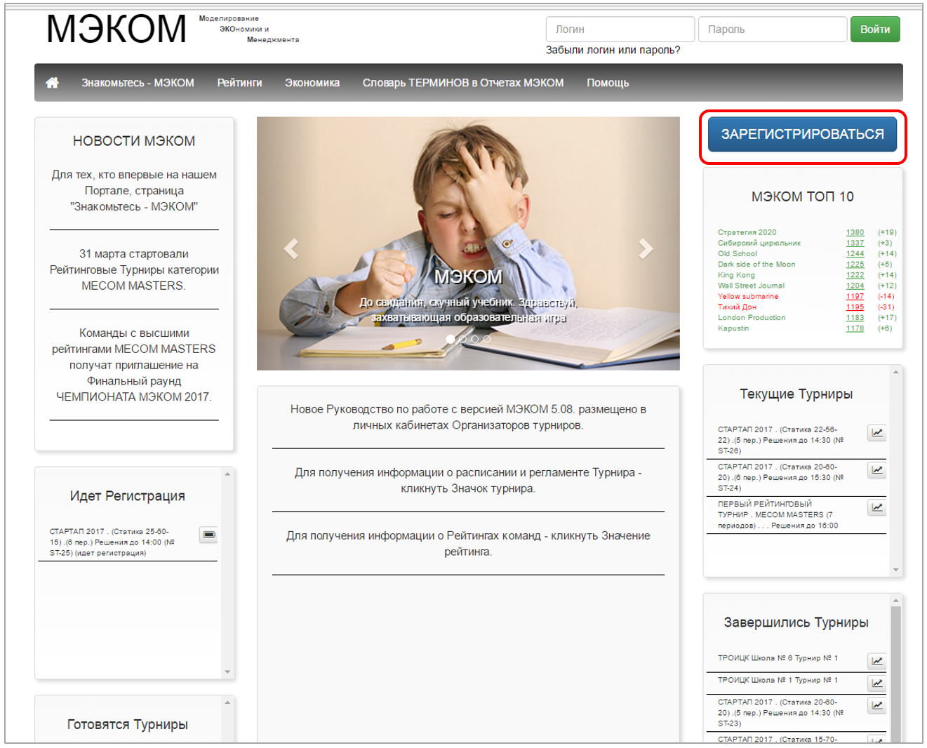 Содержит информацию о ближайших Турнирах, Рейтингах команд, Новостные ленты и входы на страницы МЭКОМ в соцсетях.