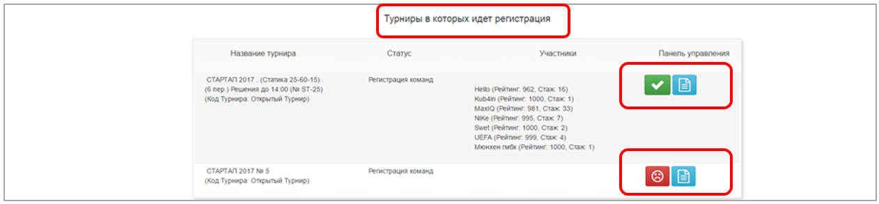 в Панели управления турниром означает, что ваша команда в данный момент не может зарегистрироваться в этот турнир, поскольку не выполняет требования по минимальному значению Рейтинга или Стажу команды (количеству сыгранных турниров).